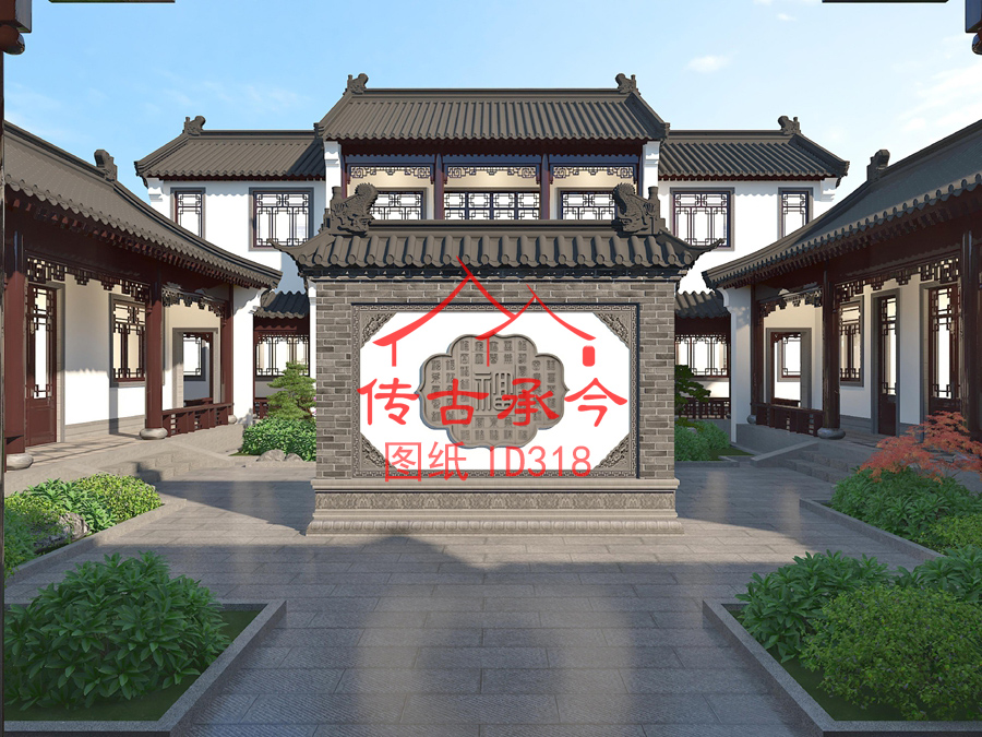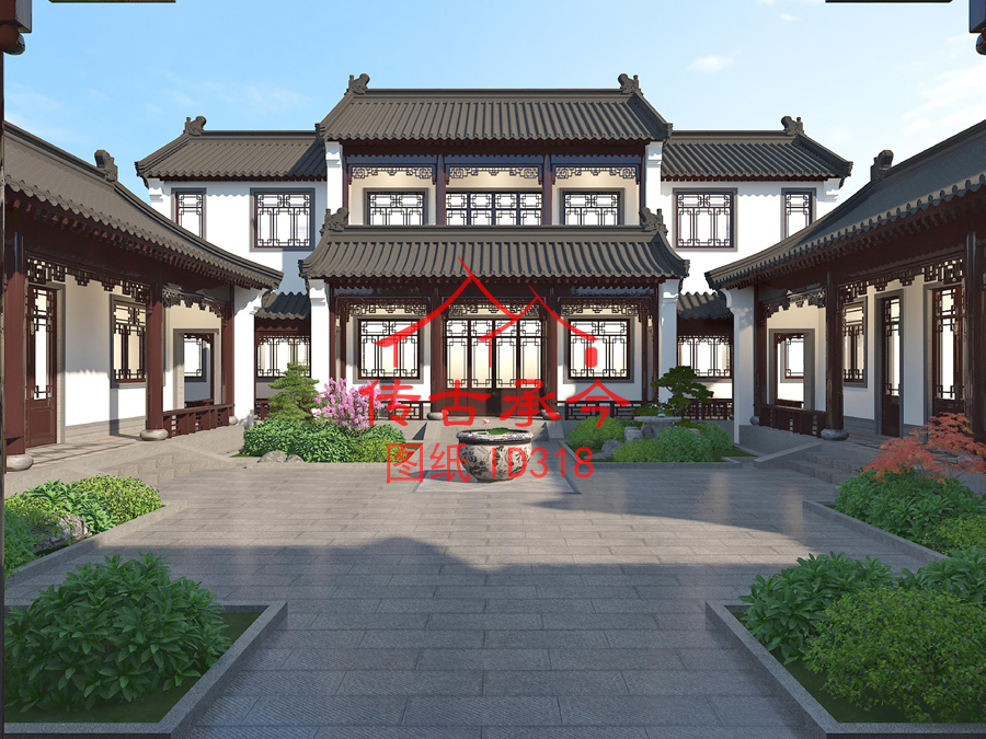 編號318:25.2*31.6米二層新中式白墻灰瓦硬山頂四合院全套施工圖紙設(shè)計圖紙