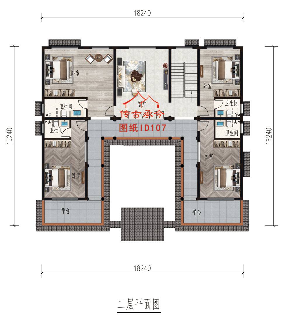 編號(hào)107:18.2*16.2米新中式二層歇山頂四合院