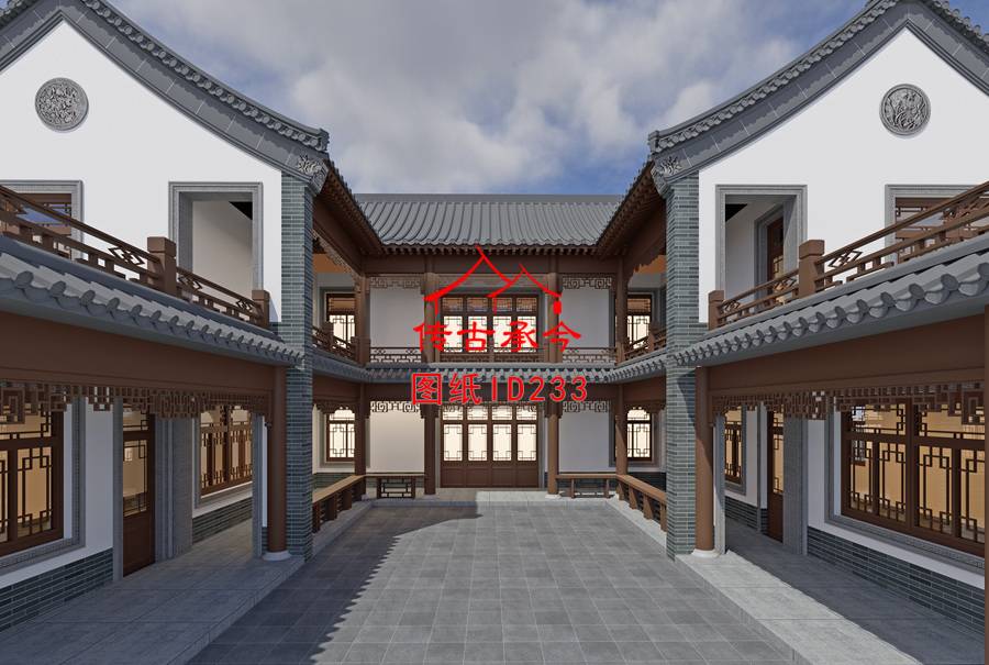 編號233:21.2*18.2米二層帶露臺U型布局四合院全套施工圖紙?jiān)O(shè)計(jì)圖紙